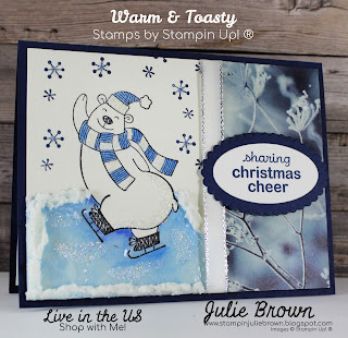 The cold weather outside has made me think about outdoor activities.  Living in New Mexico we didn't have cold enough weather or large ponds that would ice over so that you could ice skate on them.  It was something I always wanted to do growing up!  We didn't even have an indoor ice skating rink when I was young.  So I am making a card to remind of a childhood dream.  For this card I used the Warm & Toasty Stamp set by Stampin Up®.  I also used the Feels Like Frost Designer Series paper which I though added a great touch to the card.  I did do a video for this card so if you'd like to watch it just click on the link below and you'll be taken to my facebook page!